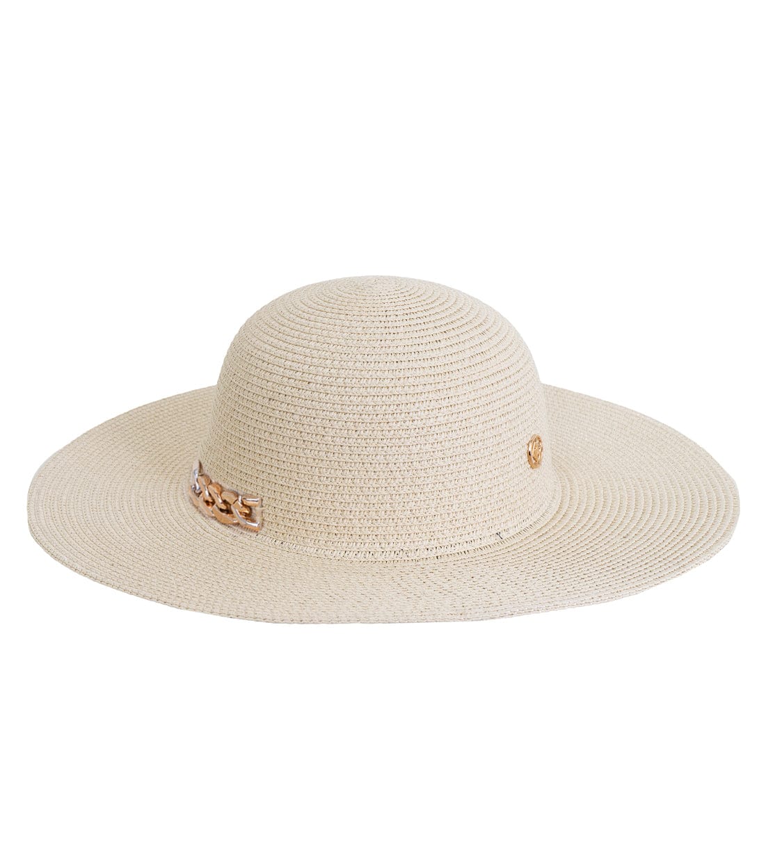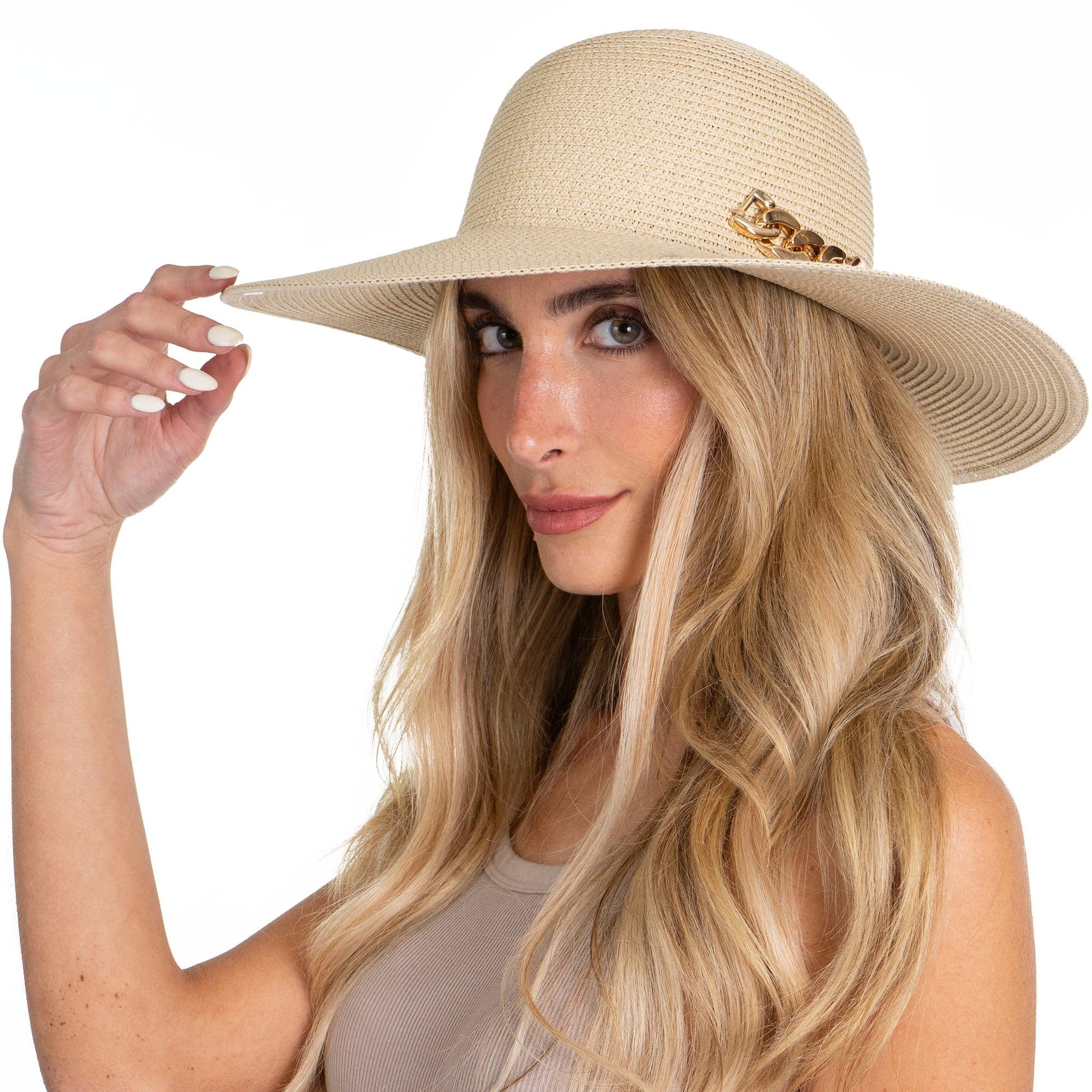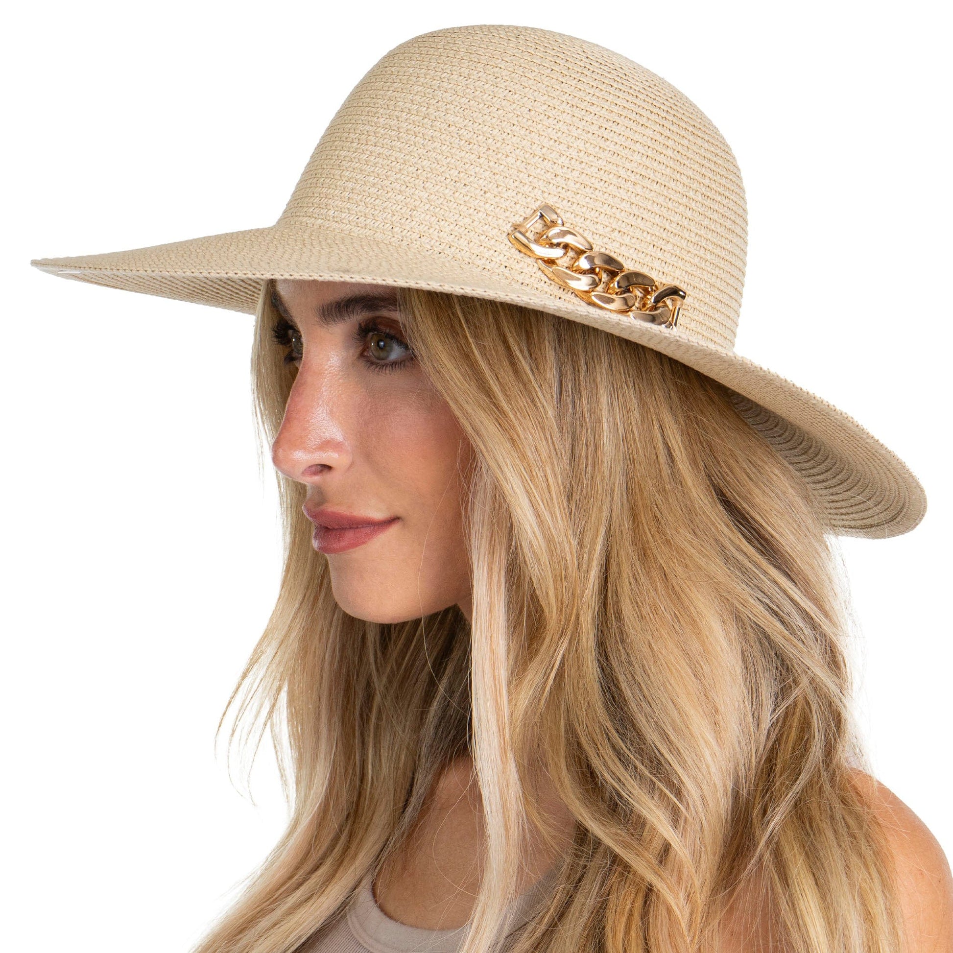 Elevate your warm-weather wardrobe with the Adrienne Vittadini Straw Floppy Hat. Featuring a sleek metallic chain detail and a wide, sun-shielding brim, this hat combines timeless elegance with everyday practicality. Made from lightweight, breathable straw and offering UPF 50+ protection, it's the perfect accessory for beach days, garden parties, or sunny strolls.