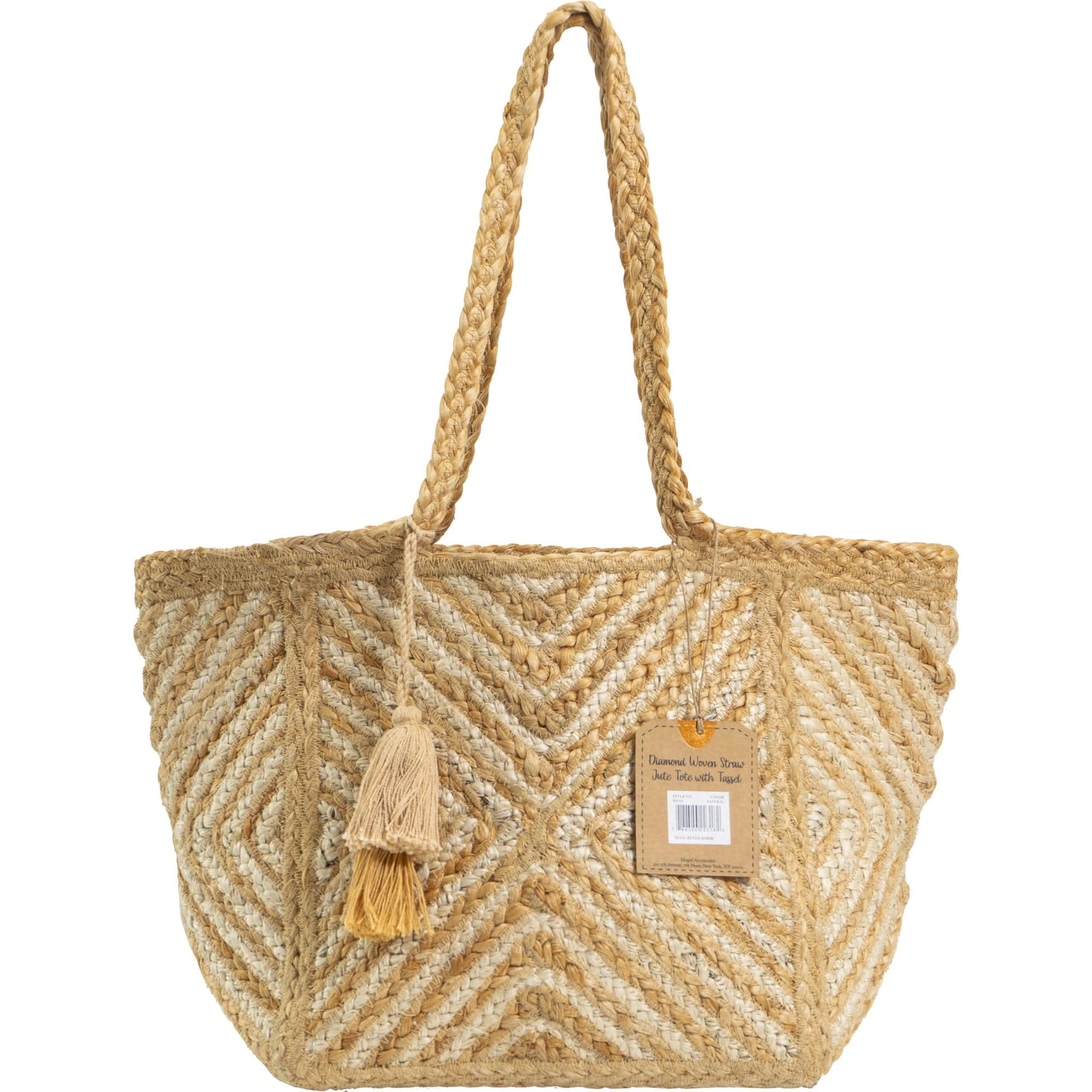 Add a stylish and sustainable touch to your wardrobe with the Magid Natural Jute Woven Diamond Pattern Tote with Tassels—your go-to accessory for effortless, eco-chic style!
