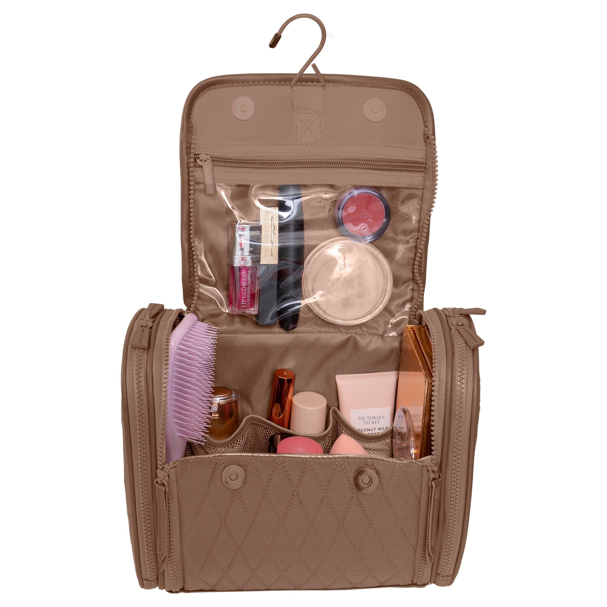 Simplifying access to essentials with easy-to-organize compartments and a hanging hook.